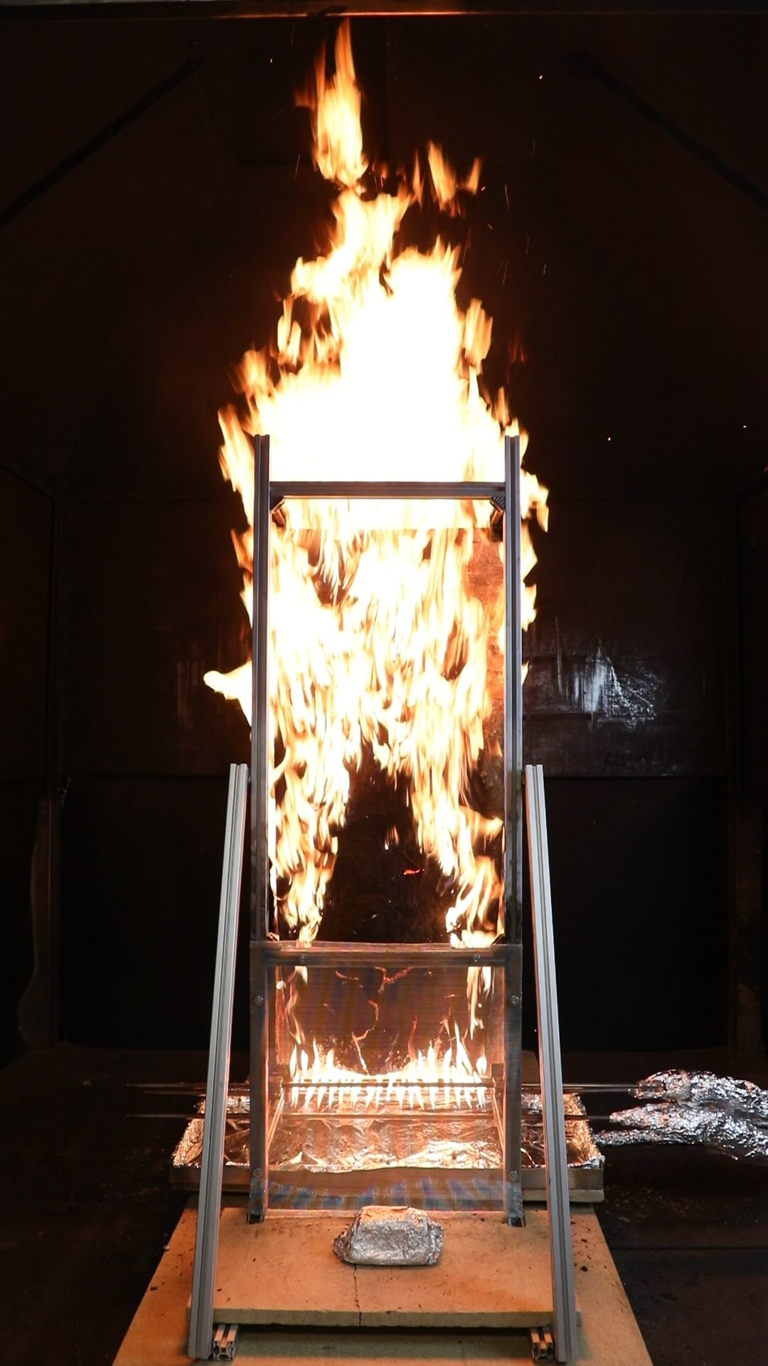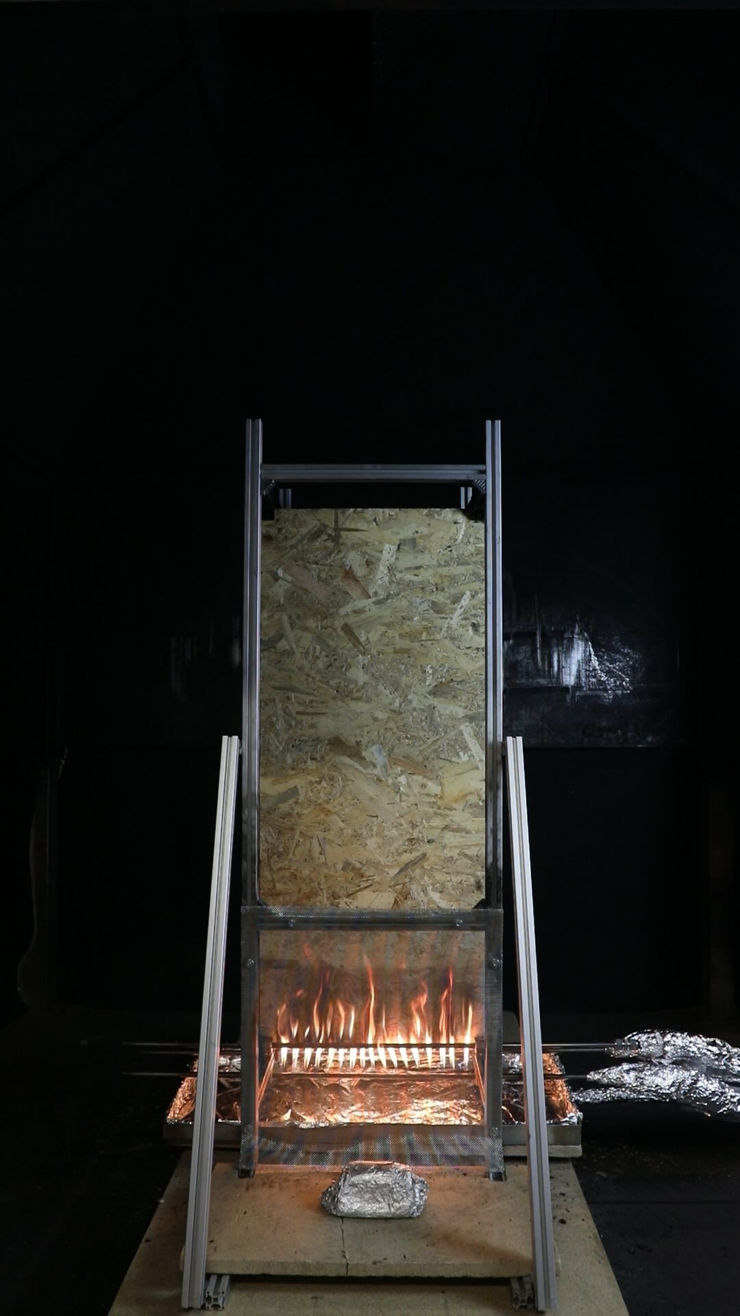 At approximately 7 minutes the OSB panel began to touch the insulation panel, affecting the mass measurements. At approximately 9 minutes the OSB panel began to collapse, causing a sudden change in the mass measurements as debris fell into the debris tray, onto both load cells, or off the entire assembly.