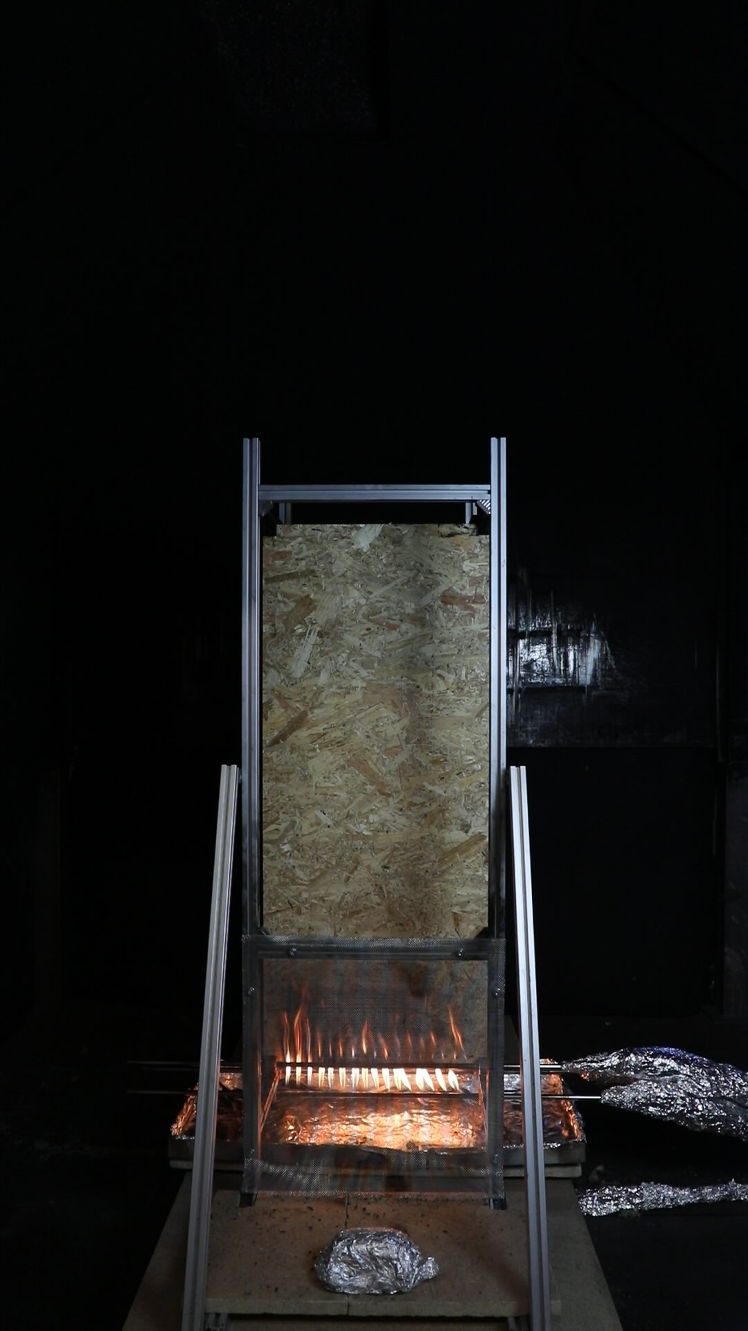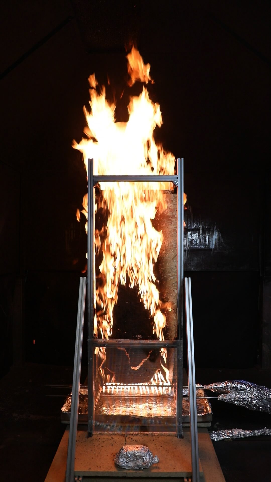 At approximately 6 minutes the OSB panel began to touch the insulation panel, affecting the mass measurements. At approximately 8 minutes the OSB panel began to collapse, causing a sudden change in the mass measurements as debris fell into the debris tray, onto both load cells, or off the entire assembly.