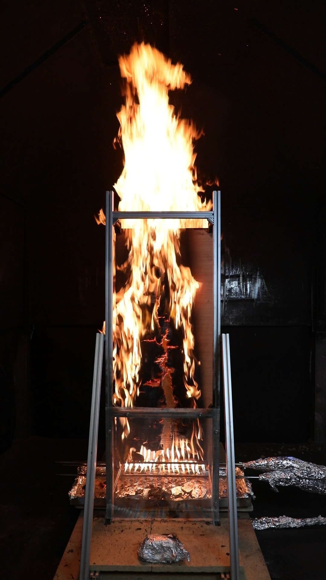 At approximately 6 minutes the plywood panel began to touch the insulation panel, affecting the mass measurements. At approximately 7 minutes the plywood panel began to collapse, causing a sudden change in the mass measurements as debris fell into the debris tray, onto both load cells, or off the entire assembly.