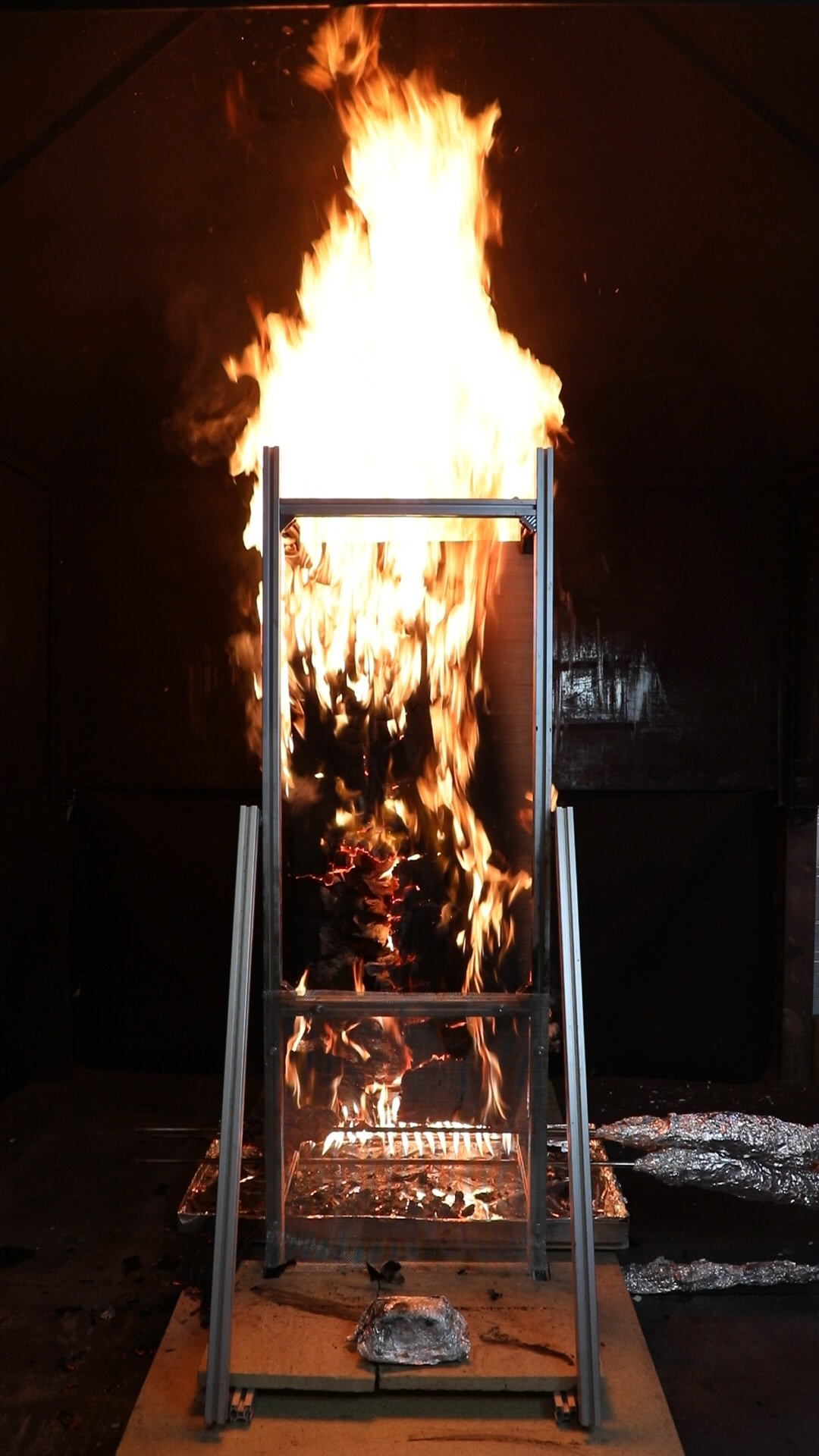 At approximately 4 minutes the plywood panel began to touch the insulation panel, affecting the mass measurements. At approximately 5 minutes the plywood panel began to collapse, causing a sudden change in the mass measurements as debris fell into the debris tray, onto both load cells, or off the entire assembly.