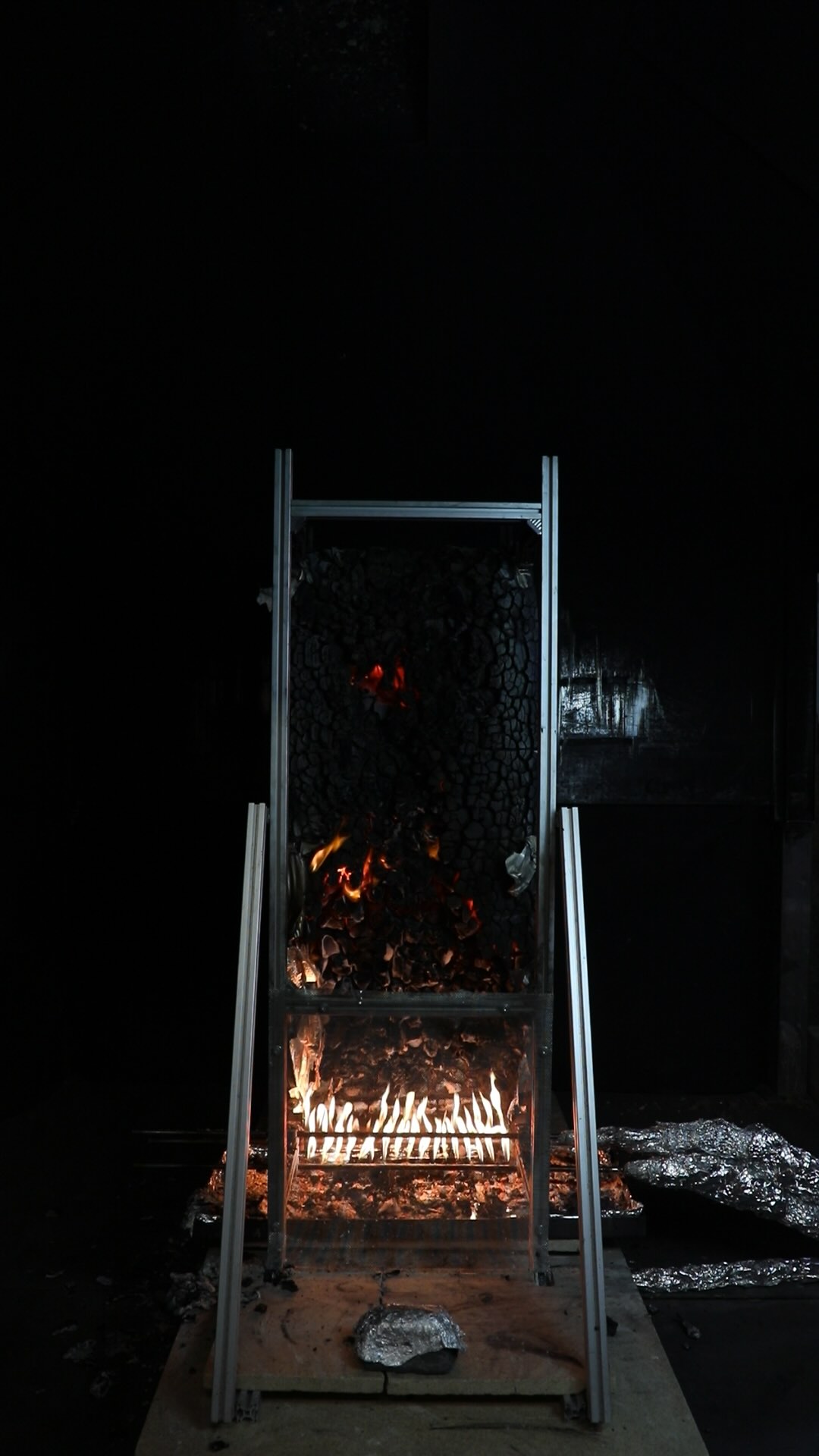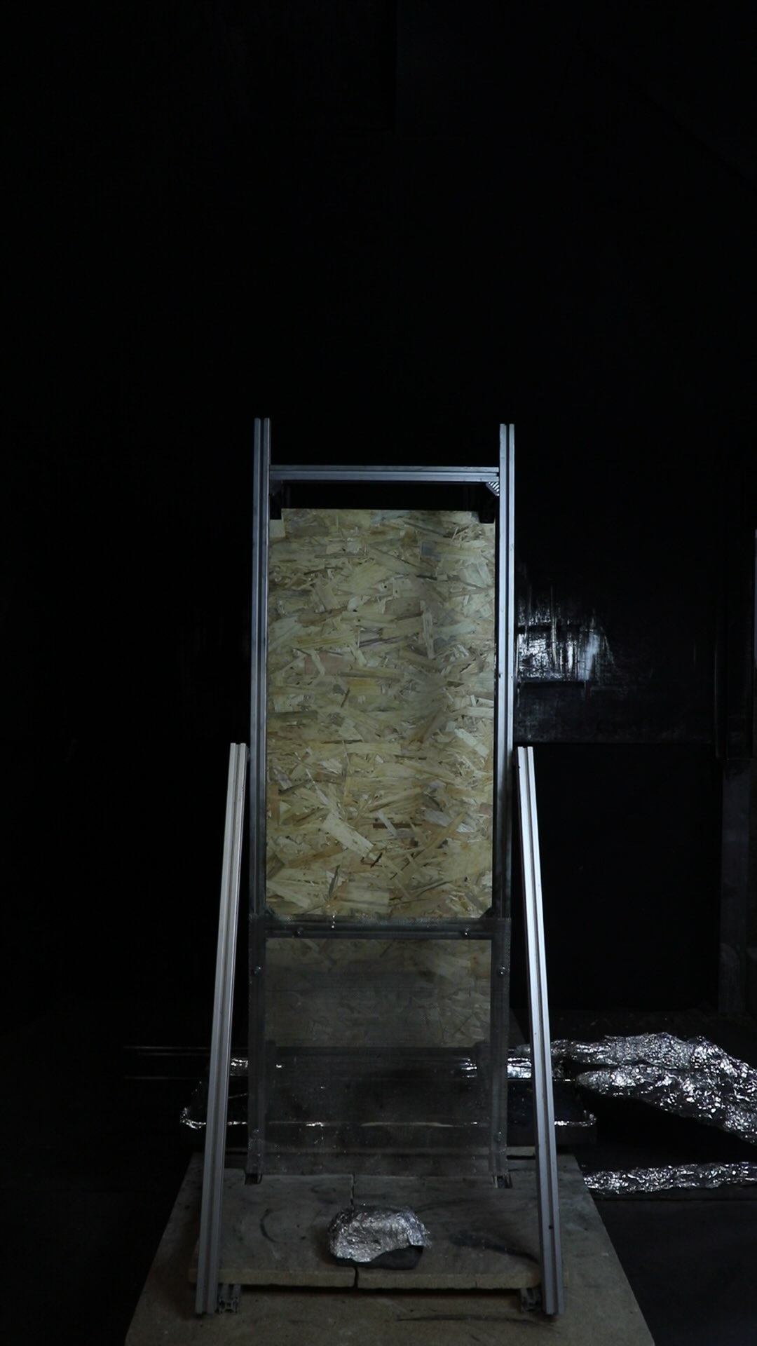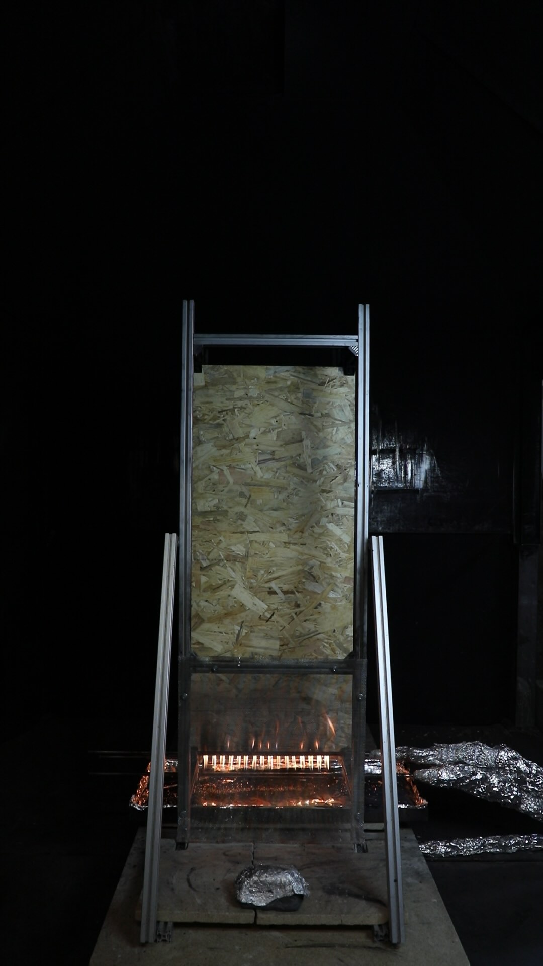 At approximately 5 minutes the OSB panel began to touch the insulation panel, affecting the mass measurements. At approximately 7 minutes the OSB panel began to collapse, causing a sudden change in the mass measurements as debris fell into the debris tray, onto both load cells, or off the entire assembly. The Phenolic foam insulation was seen to continue smouldering after the experiment was terminated, requiring extinguishment.