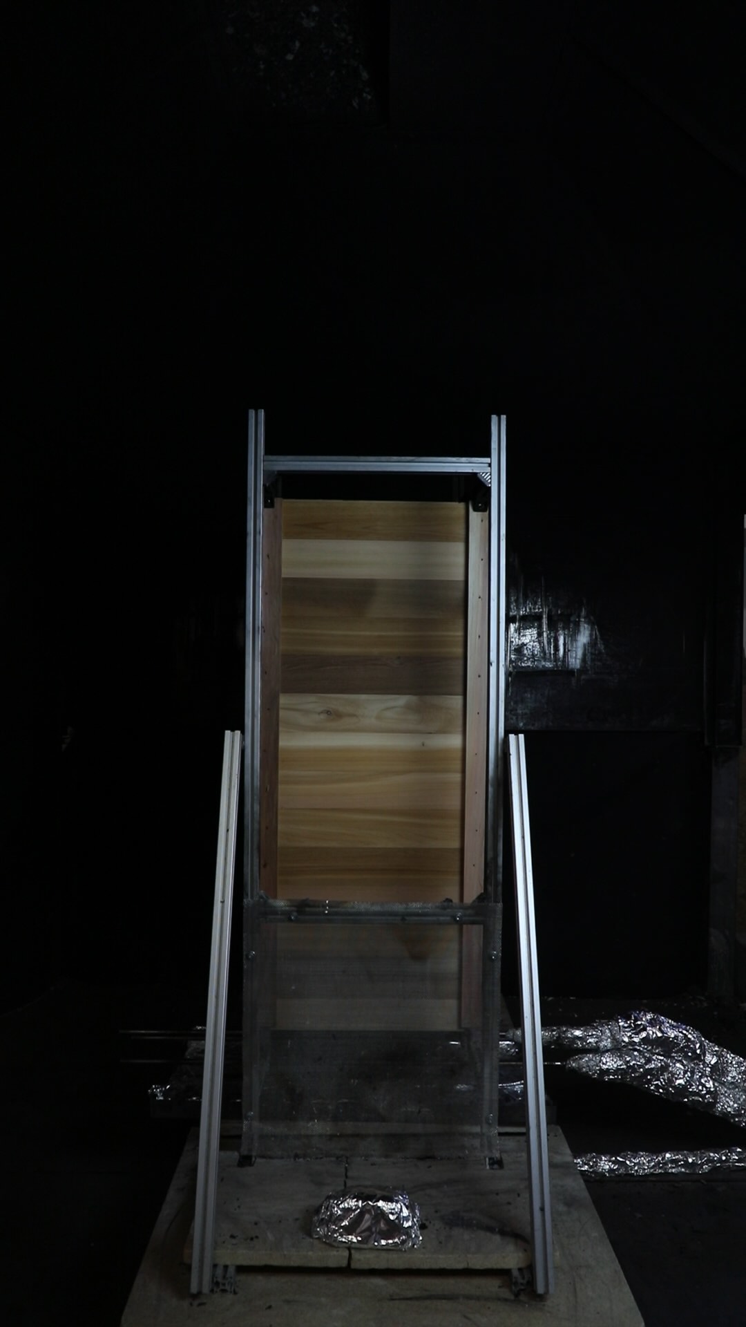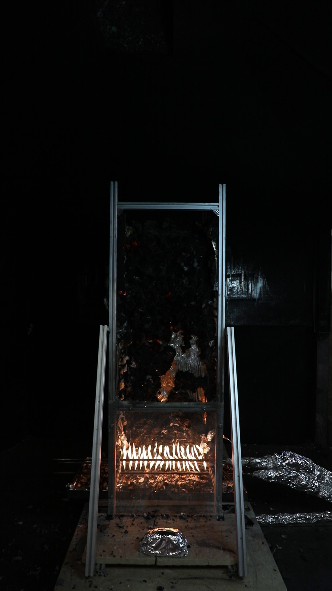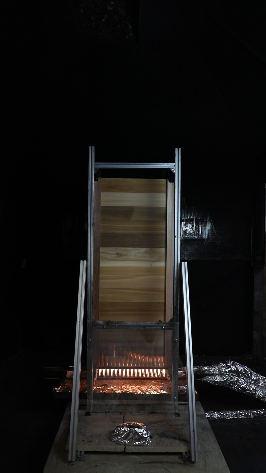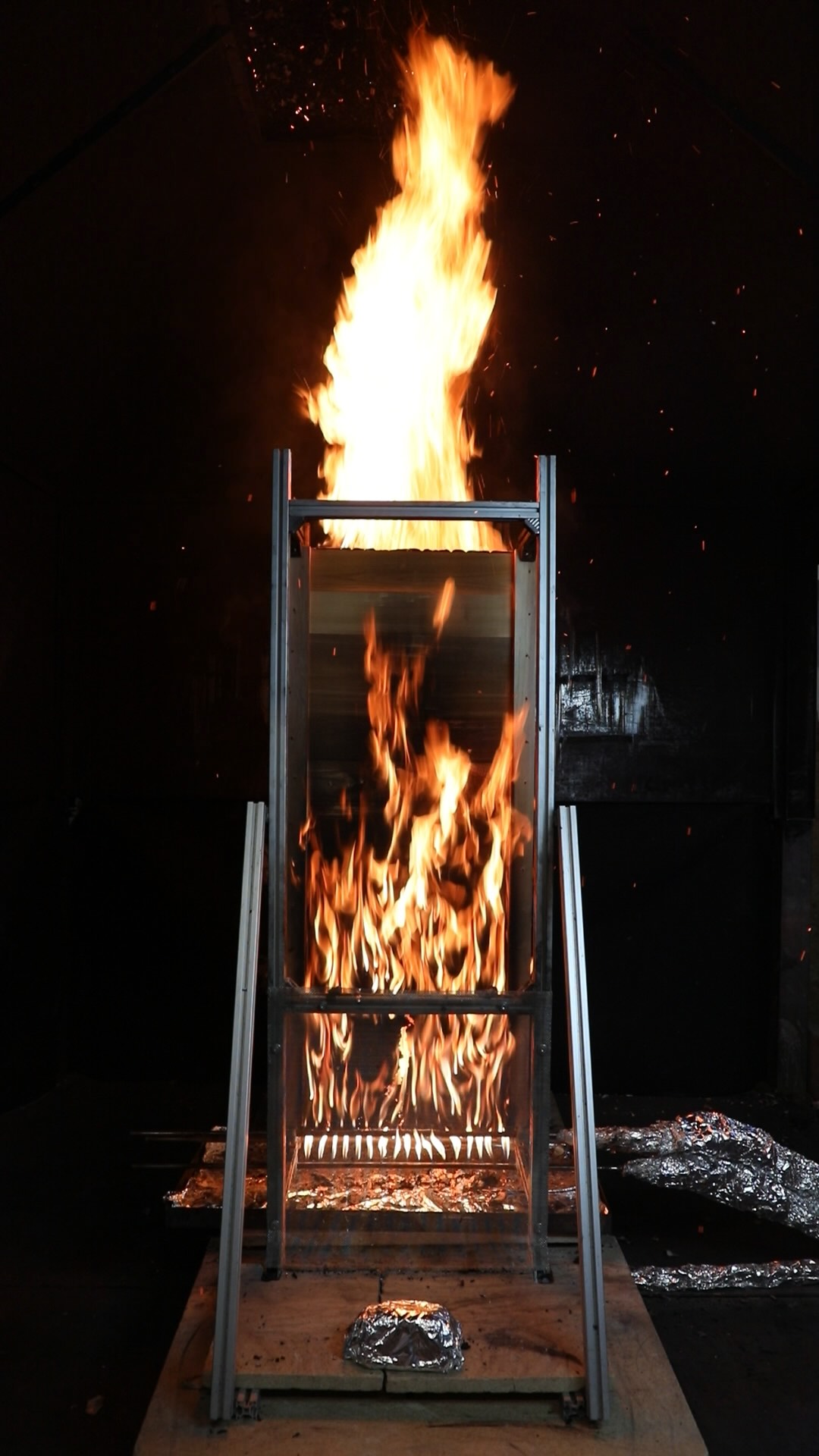 At approximately 14 minutes ignition of the cedar vertical supports was observed, combined with increased smouldering within the Phenolic foam insulation, leading to a secondary peak in fire size. The Phenolic foam insulation was seen to continue smouldering after the experiment was terminated, requiring extinguishment.